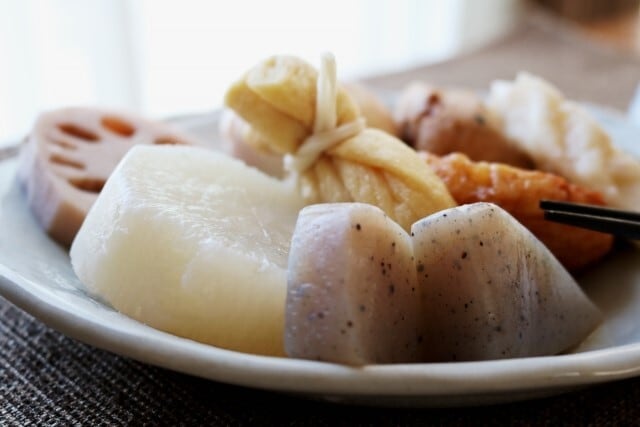 しいたけと干大根を1晩漬けこんで出汁をとり、その他、シイタケやマッシュルーム、白菜 やトマトなど様々な野菜の旨味が溶け込んでいるのが、美味しさの秘密。